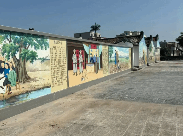 继续前行,队员们来到了治水广场。这个广场是驻镇帮扶工作队深度发掘清代本地乡贤黄武贤老提督治水事迹后精心打造的。广场内,石板砖路面、浮雕装饰以及黄武贤生平事迹壁画彩绘交相辉映,既展现了治水文化的深厚底蕴,又成为了村民休闲娱乐的好去处。