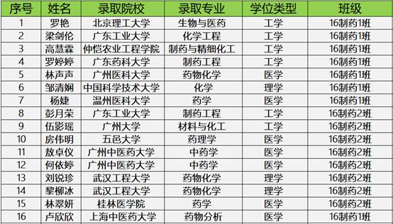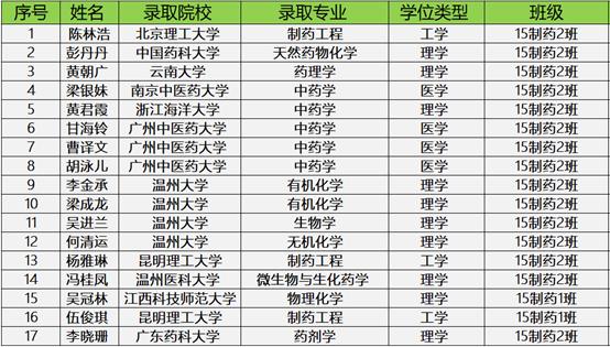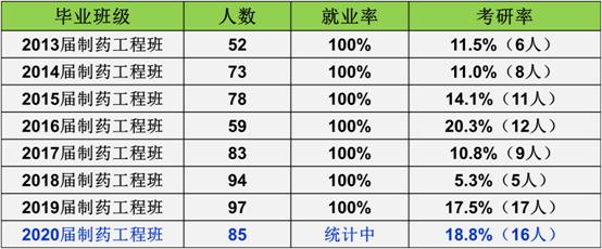 本专业学生考研人数逐年上升,录取率居同类院校榜首。2013年至今,研究生考取人数达到84人,分别被北京理工大学、中国药科大学、暨南大学、南京大学、云南大学等高水平大学录取。