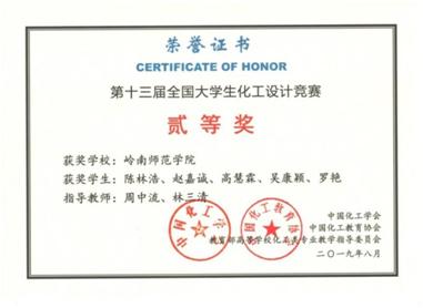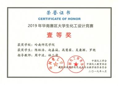 2019年获得全国大学生化工设计竞赛二等奖、华南赛区一等奖