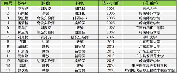 主要业绩:博士,副教授,研究生导师。主要从事过渡金属催化有机功能分子的合成与应用研究。目前主持国家自然科学基金、广东高校优秀青年创新人才培养计划项目、广东省博士启动基金各1项。目前在国际顶级化学期刊发表论文二十多篇;广东省"千百十人才工程"校级培养对象,2009获得教育部博士学术新人奖,2014年评为广东省优秀博士论文。
