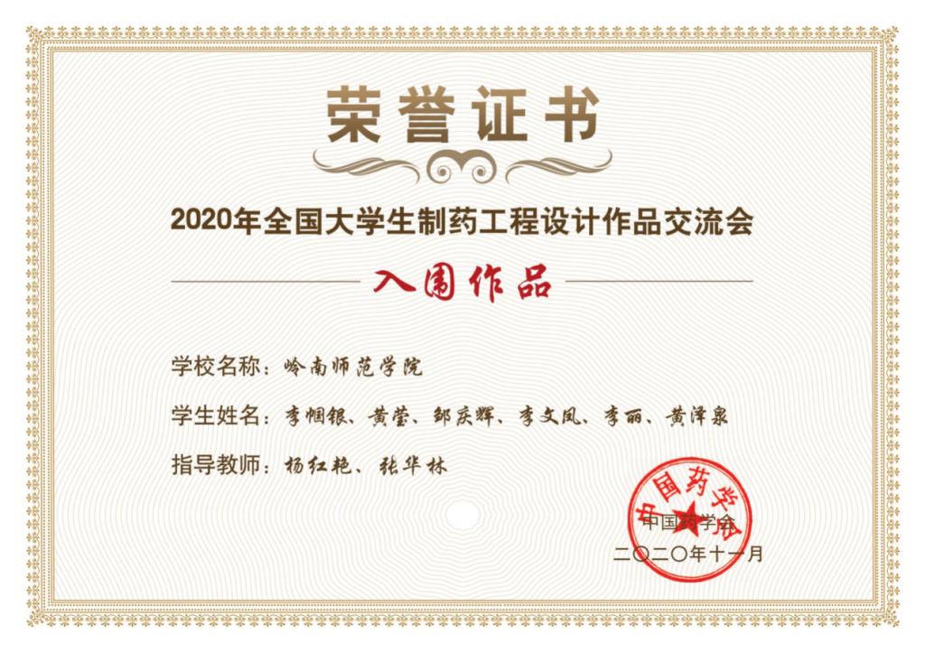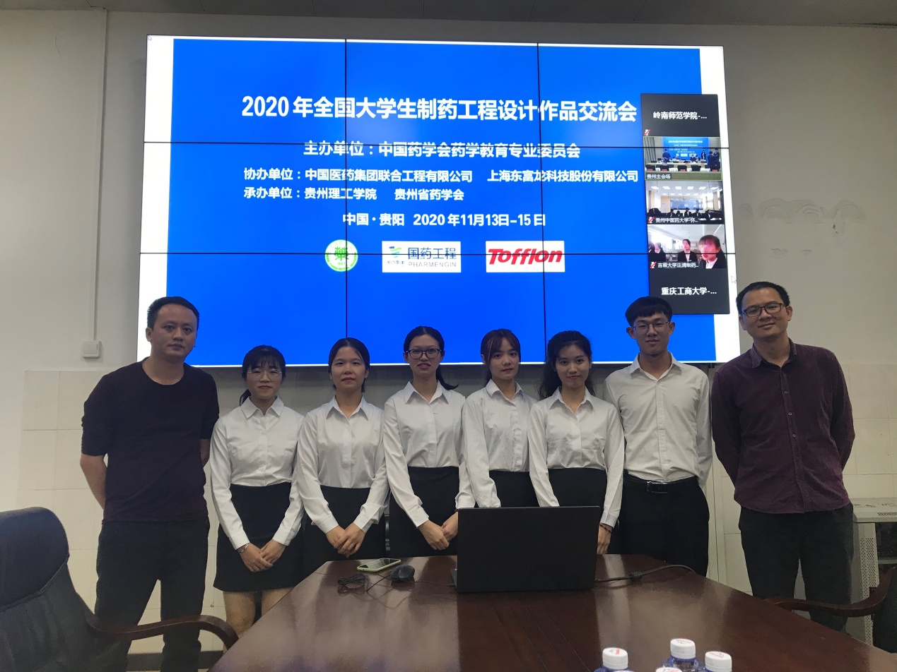 11月15日,全国大学生制药工程设计作品交流会(即第十届“国药工程—东富龙杯”全国大学生制药工程设计大赛总决赛)在贵州省贵阳市举行。化学化工学院周中流、林三清老师指导的“智慧蓝液队”(孙佳薇、曹欣、黄韫茹、赖俊杰、黎翠萍、李美玲)获得“优秀作品”证书奖(全国一等奖),连续四年进入全国总决赛,连续两年获全国最高奖;杨红艳、张华林老师指导的“岭梦后浪队”(李帼银、黄莹、邹庆辉、李文凤、李丽、黄泽泉)获“入围作品”证书奖(全国三等奖)。