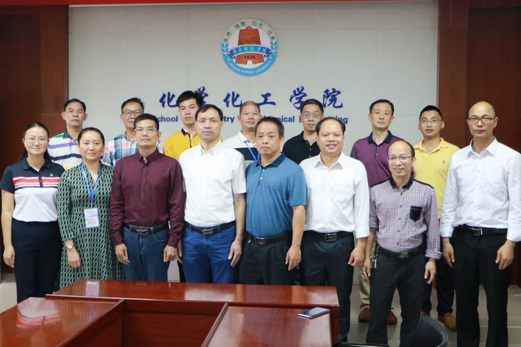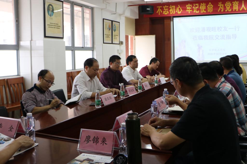 10月14日,1995届应化专业校友、吴川振文中学党总支副书记、校办主任潘观旺一行到化学化工学院参观交流。化学化工学院党政领导与优秀校友一行共同座谈交流、观看学校宣传资料,并围绕化学化工学院建设发展及化学学科的基础教育发展进行了深入交流。座谈会由化学化工学院党委书记赵海波主持。