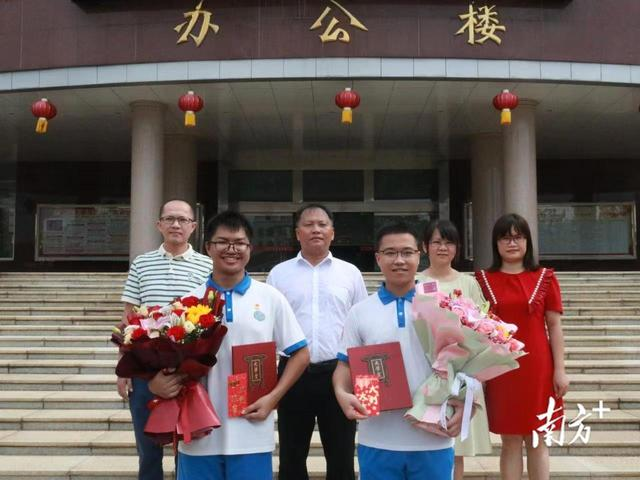 提前批收到北大录取通知书的翁维等考生与班主任梁炳超等老师合影留念