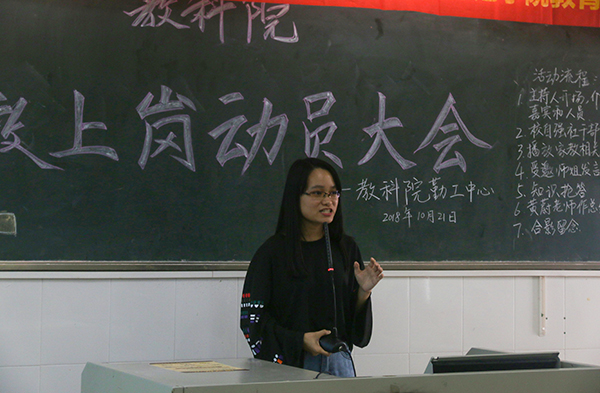 校自强社干部陈虹彤从家教部的简介、家教兼职的注意事项及家教部教员选拔三个方面进行讲解,使同学们对家教工作有进一步的了解。