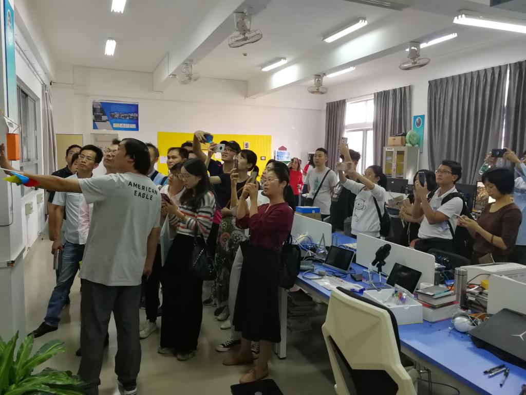 2019年11月7日下午,培训班进行了结业典礼,在曾绍庚老师的引领下,学员们做了互动游戏,之后参观了物联网俱乐部项目——自动导航小车、智能卷帘门窗、防触电智能插座和跟随搬运小车,进行了技术交流,学员们表现出了浓厚的兴趣。