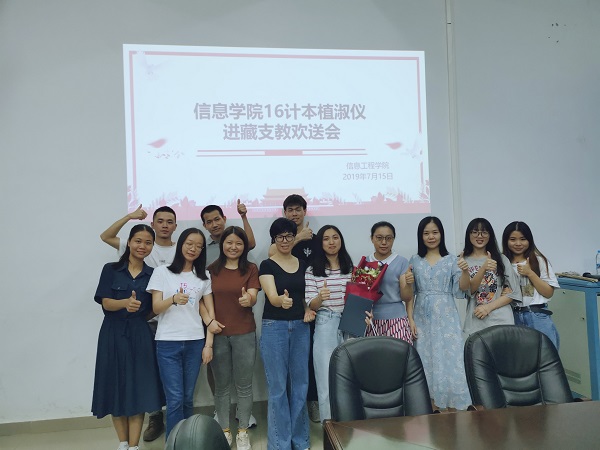 7月15日,信息工程学院于雷阳楼b栋101会议室举行2019年西藏支教学生欢送座谈会。信息工程学院党委副书记陈明娟、计算机工程系主任闵笛,辅导员彭东丽、15计本班赴藏支教学生植淑仪及学生代表出席了座谈会。会议由彭东丽主持。