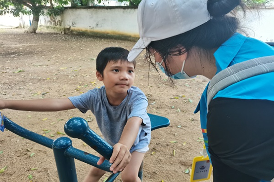 队员在与小朋友使用普通话交流互动。(梁淇 摄)