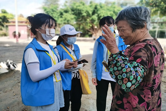 队员在询问环卫阿姨有关于村庄和普通话普及的情况。(彭文笑 摄)
