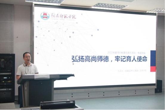 本次师德教育月专题讲座邀请了法政学院院长刘鑫淼教授做“弘扬高尚师德,牢记育人使命”专题演讲报告。刘教授在报告中指出,当前我国的教育事业正处于大发展大变革大调整的时期。自2018年以来,党中央频繁召开教育会议,教育政策密集出台,深化教育改革的决心非常坚定,这对新时代的教育从业者提出了更新的、更高的要求。