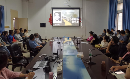 会议首先传达学习了学校《岭南师范学院关于开展红色校史人物学习活动的通知》精神和要求,对学院开展红色校史人物学习活动做出了安排。会议上,李海文简要介绍了岭南师范学院办学历史悠久,涌现出谭平山、黄学增等知名红色校史人物,具有丰富的红色基因。黄学增就是红色校史的代表人物之一。他早年就读于雷州中学,是大革命时期广东省四大农运领袖之一、广东南路革命先驱。为了积极响应国家和学校关于“传承红色基因”的号召,李海文带领大家一起观看了《黄学增》专题片,通过视频学习、传承黄学增革命先辈的伟大革命精神。