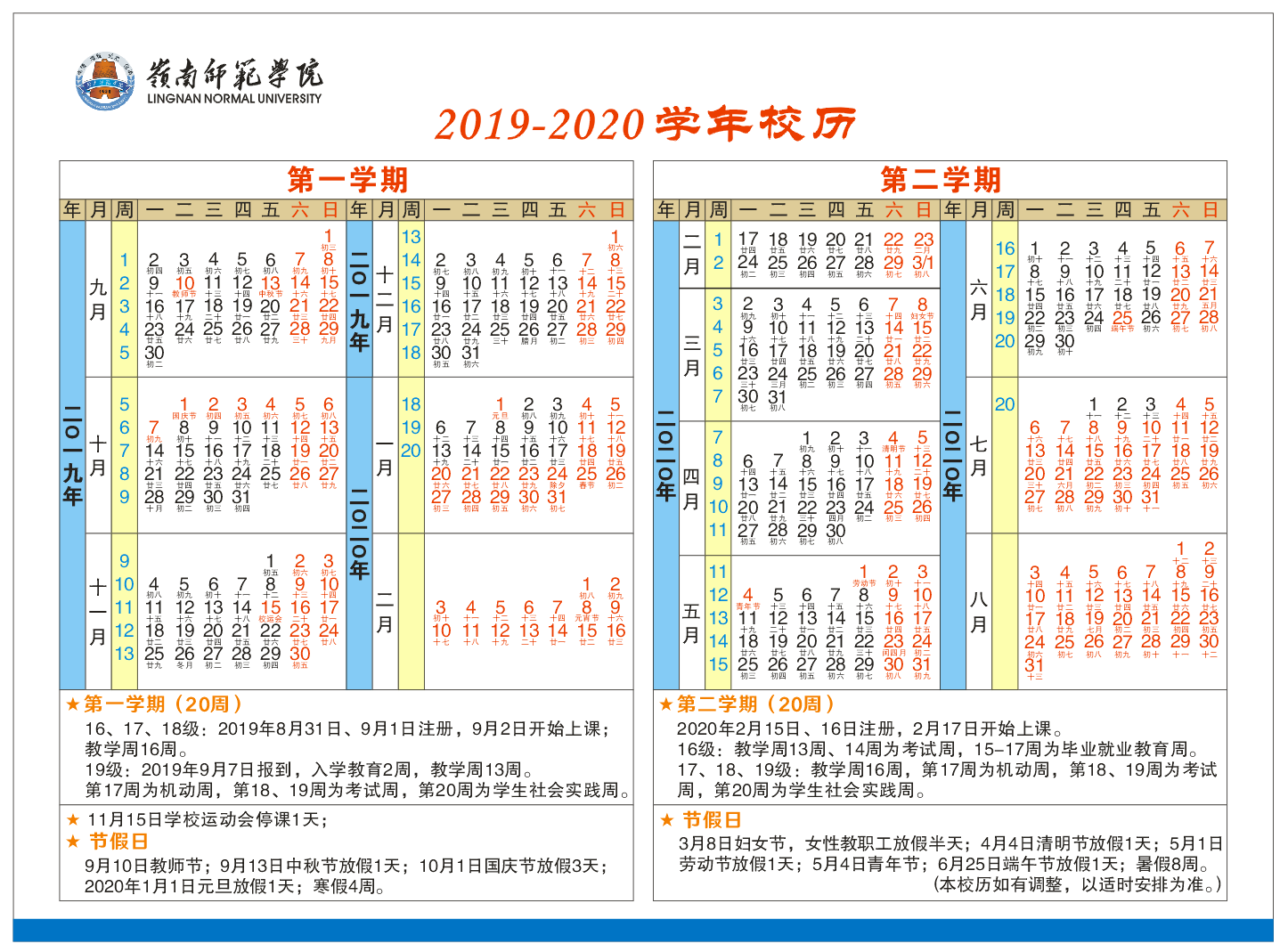 2019-2020学年校历