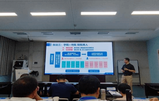 下午,西安交通大学教务处副处长杨建科教授以“AI+专业建设(高校管理的理念变革与人才培养的创新实践--以西安交大为例)”为题作了一场别开生面的报告。杨教授首先分享了西安交大的本科人才培养模式,特别是交大的人才特色培养专项计划。接着以实际工作中如何通过“加减乘除”的做法深入探讨了AI时代背景下人才培养模式创新的交大实践:做加法以“束帛加璧,汇聚全面发展资源”,做减法以“破除障碍,营造自由成长空间”,做乘法以“交叉融合,建构复合培养体系”,做除法以“析精剖微,凝练人才培养焦点”。交大在通识教育课程建设、学院+书院的双院协同培养、课程思政建设、专业除“虚”、课程除“水”、评价除“软”、服务除“碎”等方面的规划、举措与成效,深深触动了全体学员。