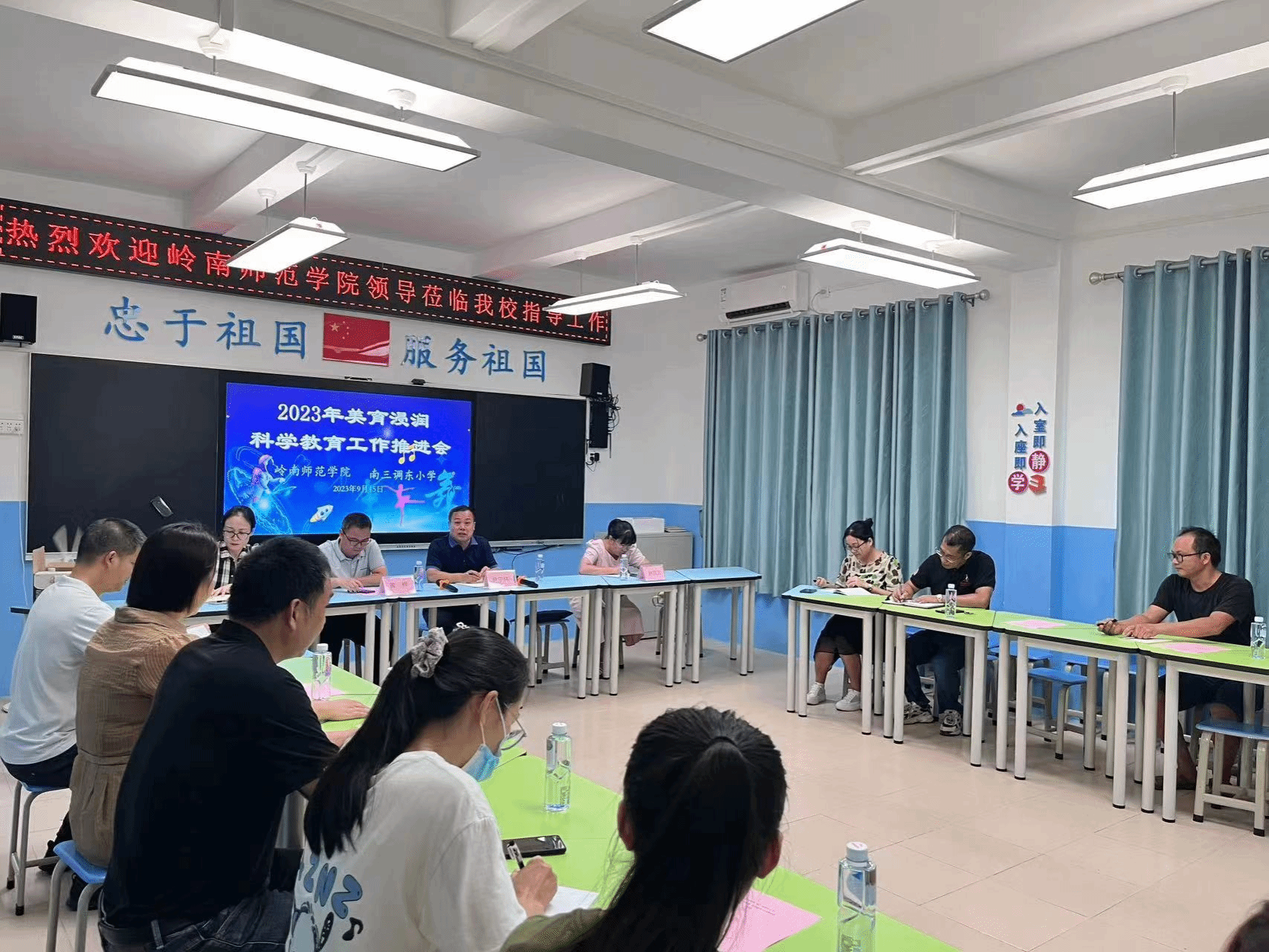 9月15日下午,学校在湛江市坡头区南三中心小学和南三调东小学召开2023年美育浸润行动、科学教育工作推进会。会议由教务处副处长兼通识教育中心主任尹宁伟主持,教务处副处长黄桦及南三中心小学张振忠校长、调东小学李观轩校长及相关工作人员参加了会议。