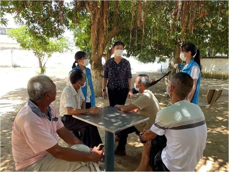 图为国家级普通话测试员、从事普通话教学20余年的三级教授、岭南师院退休教师崔静走进文丹村村民推广普通话。