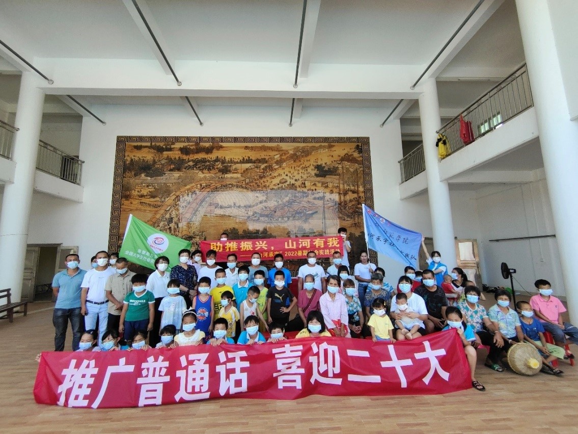 图为“山河承宇”社会实践队到文丹村开展“推广普通话,喜迎二十大”推普活动时与村民和小学生合影。
