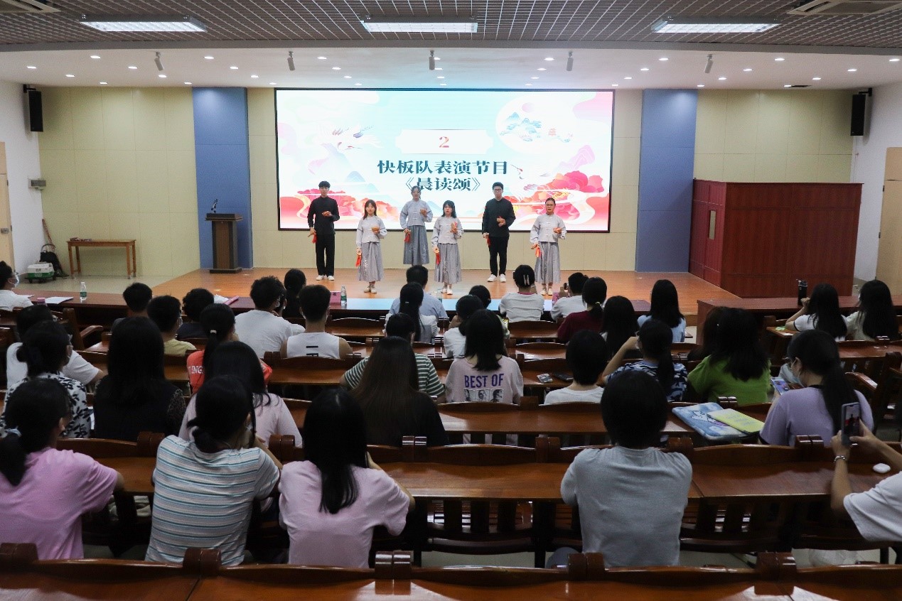 当日活动在快板表演《晨读颂》中拉开帷幕。来自文传学院快板队的同学身着古色古香的衣装,用一口标准流利的普通话,一手游刃有余的快板绝活儿,带动起全场欢快活泼的活动氛围。2020级优秀学生代表陈柏宇上台为大家作普通话学习经验分享,从测试须知、考试题型与技巧、普通话重难点和考试流程步骤四个方面详细介绍普通话考试的攻略方法,鼓励学子们平时利用好晨读,多练习多巩固普通话。