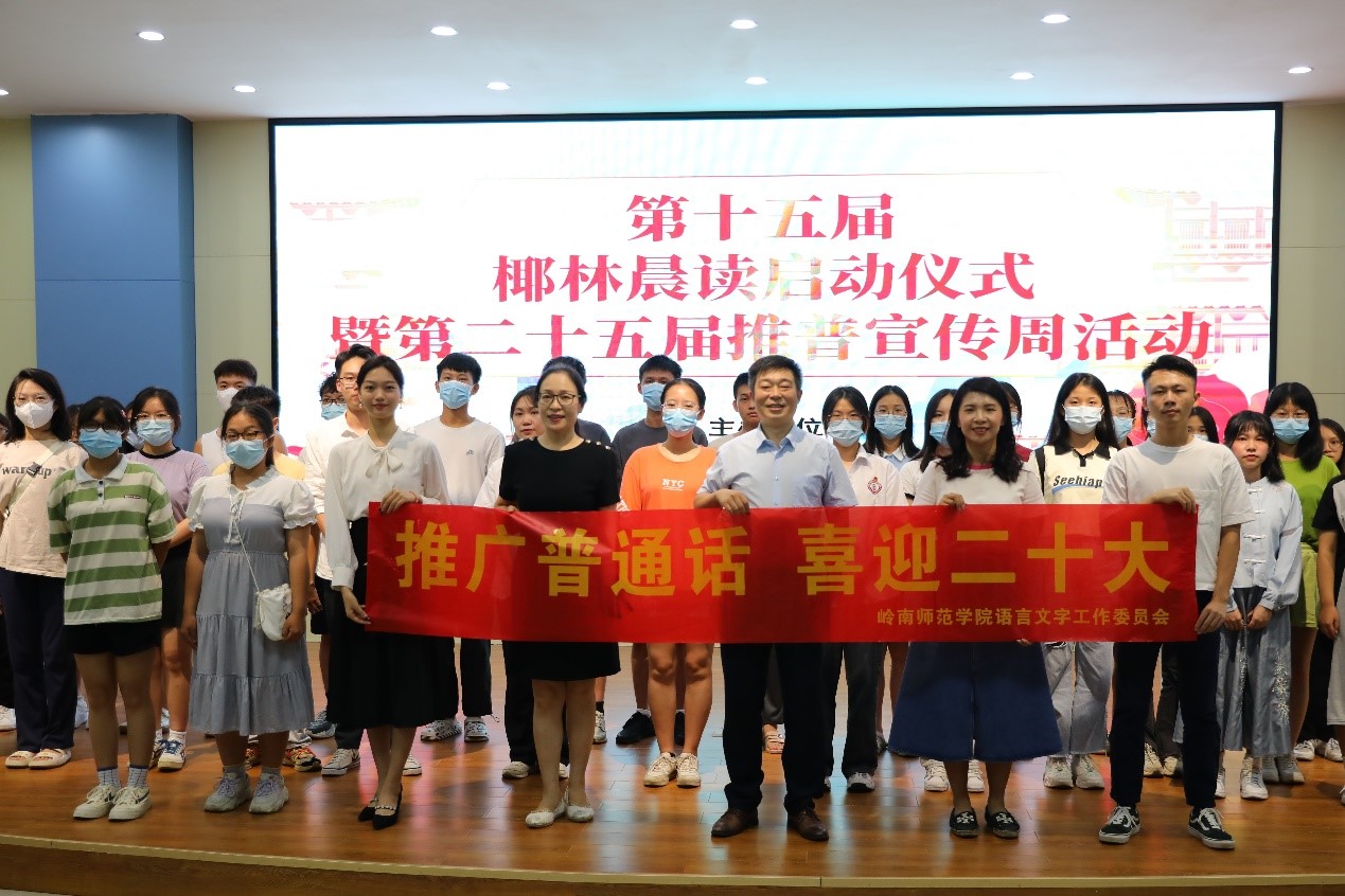 岭师新闻中心讯:“你是涅槃的烈火中飞出的金凤凰,你是神州大地上舞动的巨龙。我爱你,中国!”9月16日晚,100余名师生用饱含深情的集体普通话朗诵声,将岭南师范学院“第十五届椰林晨读启动仪式暨‘推广普通话,喜迎党的二十大’推普宣传周”活动推向高潮。