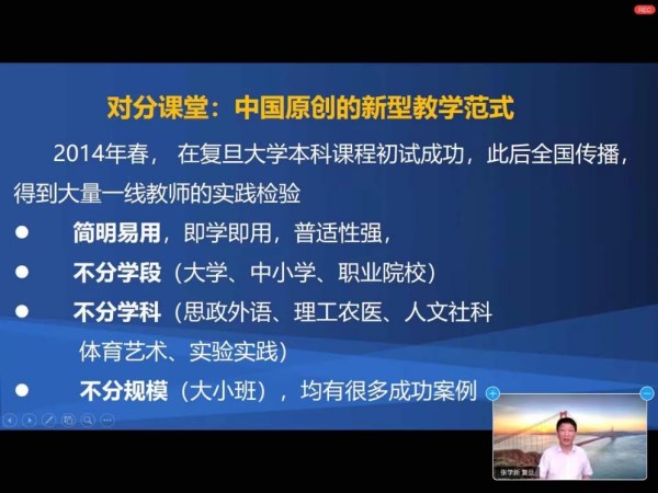 线上工作坊伊始,对分课堂创始人、复旦大学心理系张学新教授介绍了对分课堂的基本理念和优势以及在全国推广的情况。在随后的研修环节,我校外国语学院陈湛妍副院长、贺红老师与来自不同学校的骨干教师分享了他们在一线教学中运用对分课堂的经验。陈院长研究对分课堂多年,有着丰富的教学经验,是《对分课堂之大学英语》第一作者,其教学成果获得校级教学成果奖三等奖;贺老师是大外部拓展课旅游英语课程的讲师,在课堂中积极实践对分课堂的教学模式,并获得多项课题与成果奖。两位老师与学员们深入交流了大学英语阅读教学和拓展课的对分课堂教学实践,以长期的实践经验证明对分课堂是一种创新的、理念先进的、实用高效的教学模式,对于还在摸索高效教学模式的老师们具有很好的启示。