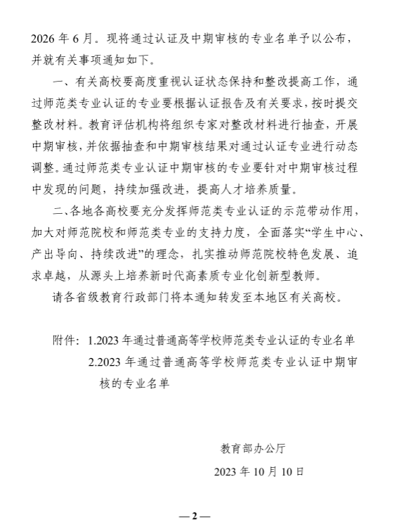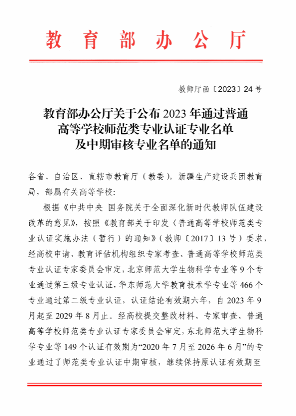 另,我校汉语言文学和化学专业通过了2023年师范类专业认证的中期审核,继续保持原认证有效期至2026年6月。我校一直按照教育部高等教育教学评估中心《普通高等学校师范类专业认证状态保持监控办法(试行)的通知》的精神,加强对我校已通过师范专业的教学质量持续改进。