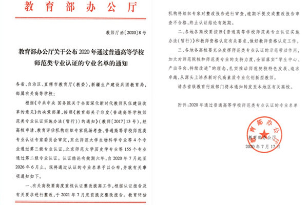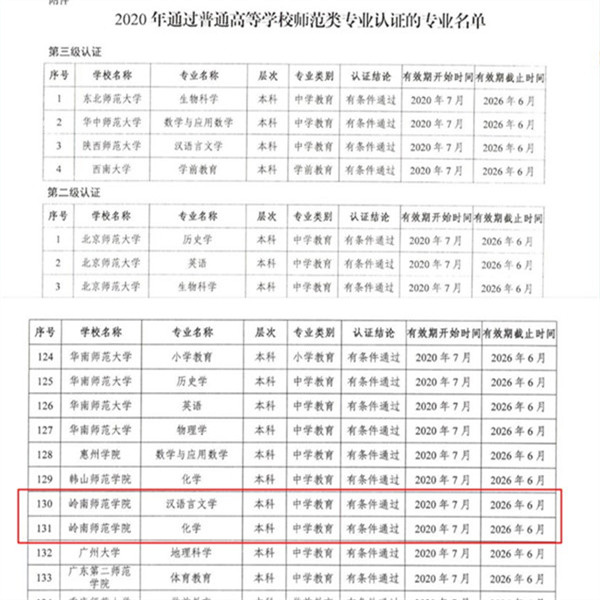7月21日,教育部办公厅公布了2020年通过普通高等学校师范类专业认证的专业名单,岭南师范学院汉语言文学、化学两个专业通过第二级专业认证,有效期六年,自2020年7月起至2026年6月。