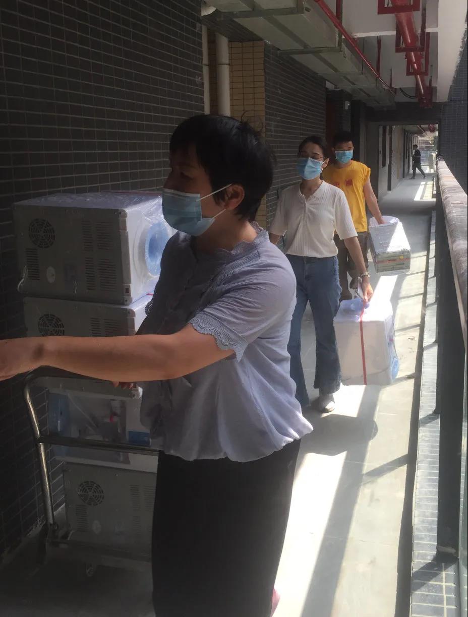 新落成的十三期学生公寓在新生报到前一天刚布置完成,新生报到当天上午一早,公司纯净水厂就开始为各宿舍配备饮水机。由于十三期公寓有南、北苑区,楼层高、宿舍多,道路设施仍未完善等,配送工作任务大、时间紧,人手又不足。