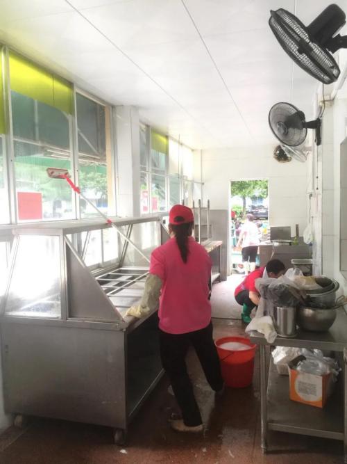 开学前,员工们已经完成了对整个食堂(包括大厅、仓库等地点)的清洁打扫和全面消毒,洗菜间、切配间、清洗间,大家仔细擦拭着餐厅每一个角落,确保无死角、无遗漏。此外,为了确保用水用电用气安全,食堂全面开放前已完成对燃气线路、水电设施和消防装置等的常规检修。