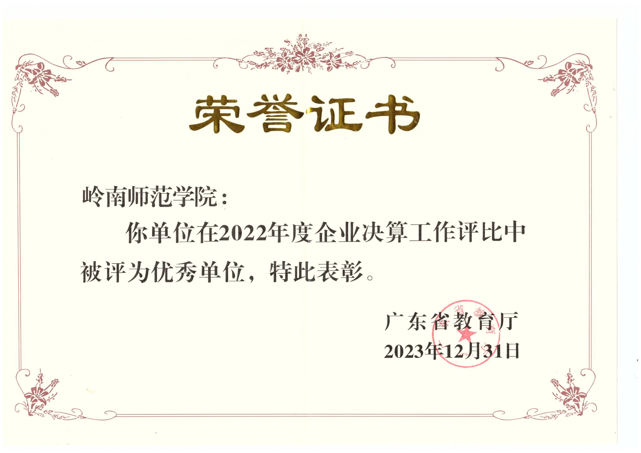 2024年1月10日,广东省教育厅在清远市组织召开全省教育系统2023年度财务决算工作培训会,会议通报了省属各学校和教育厅直属事业单位2022年度财务决算工作情况,对成绩突出的单位予以通报表彰。我校获评“2022年度企业决算类优秀单位”和“2022年度部门决算类表扬单位”。其中,获评企业决算类优秀单位,是我司作为学校企业连续两年获得教育厅的表彰。
