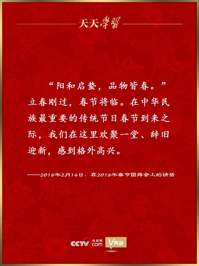 党的十八大以来,习近平总书记多次在腊月二十九举行的春节团拜会上发表重要讲话,盘点旧岁、谋划新年,向全国各族人民、港澳台同胞和海外侨胞拜年,并致以美好的新春祝福。在讲话中,习近平总书记频频引用具有新春节令特点的古代经典诗文名句抒发情怀、畅想未来。这些诗文名句如春风化雨润人心田、暖人心扉,激励着亿万人民在新的一年里追梦前行。