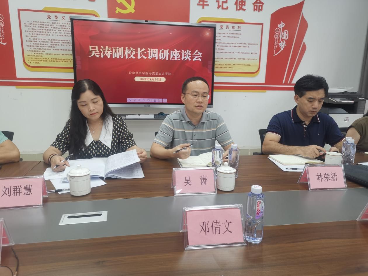 近日,副校长吴涛率科研处处长刘群慧,人事处处长林荣新、副处长陈华杰及王彦欢到马克思主义学院调研,指导其做好人才引进、科研平台建设和硕士学位点培育建设工作。马克思主义学院党总支书记邓倩文主持会议,党政领导班子全体成员参加调研。