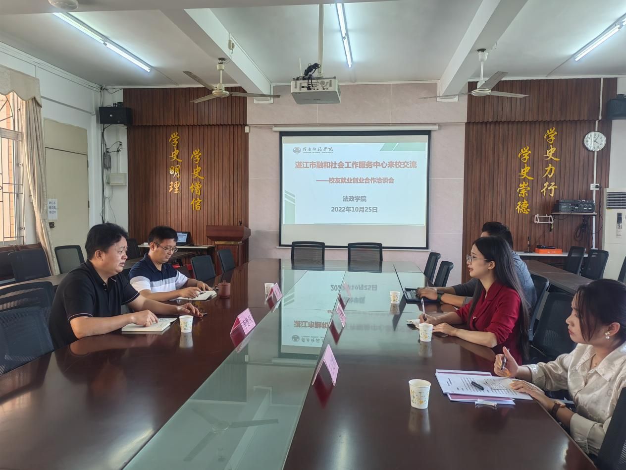 湛江市融和社会工作服务中心由我校体科院2013届知名校友吴水仙创办。10月25日,吴水仙一行应邀到法政学院进行就业创业合作洽谈。洽谈会在教三313会议室举行,法政学院党委书记李德深、副书记易贤出席会议。