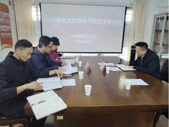 2月25日下午,根据学校民主生活会的相关要求,学报编辑部党支部召开2024年度党员领导干部民主生活会。会上,深入学习贯彻习近平总书记在中共中央政治局民主生活会上的重要讲话精神,通报了学报编辑部2023年度民主生活会整改落实情况。刘惠卿代表班子深入分析了本部门在政治理论学习、编辑队伍建设、专栏建设、作者队伍建设、重点任务执行以及廉政建设等方面的工作情况,结合思想和工作实际进行自我检视、党性分析,开展批评和自我批评。最后,唐宇副校长对民主生活会召开情况进行点评,并对2025年工作提出指导意见。