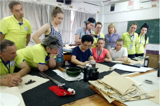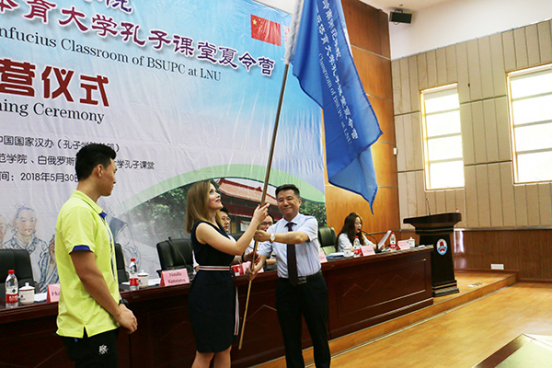 LNU Press Center News: On the morning of May 30, the Summer Camp for "2018 Confucius Classroom" of Belarusian State University of Physical Culture (BSUPC) was officially opened in our school. Twenty-one BSUPC teachers and students will hold a 10-day experience program of traditional Chinese culture in our school. Huang Wei, Vice President of LNU, presented the flag to Ms. Natallia Kastseyeva, the BSUPC camp leader, and announced the opening of the camp.