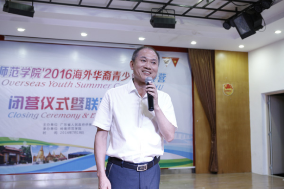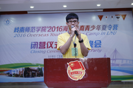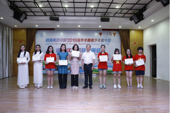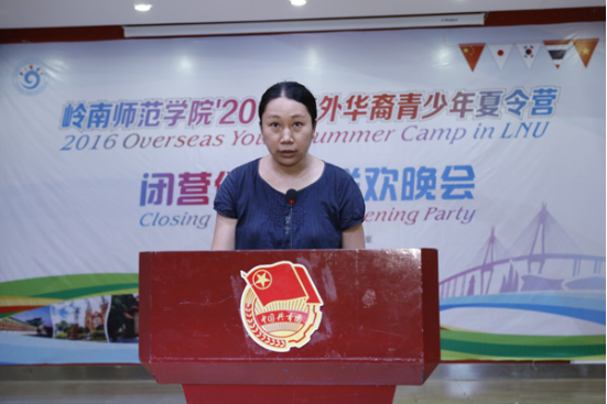 LNU Press Center News: On the evening of July 18, the closing ceremony of 2016 Overseas Youth Summer Camp was held in Room 420, Hong Yuan Dining Hall, Lingnan Normal University. Deputy Investigator Lin Li of Zhanjiang Foreign Affairs & Overseas Chinese Affairs Bureau, Chief Deng Fengguang of International Exchanges and Cooperation Division, Dean Sun Jianhua of School of Music and Dance, Dean Chen Daohai of School of Life Science and Technology, Deputy Chiefs Zheng Zhijun and Xiao Jianchun of International Exchanges and Cooperation Division, lead teachers and instructors of overseas schools, and related staff members attended this closing ceremony.