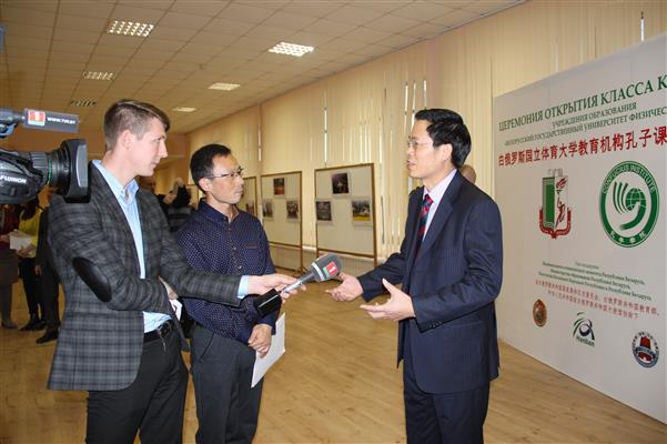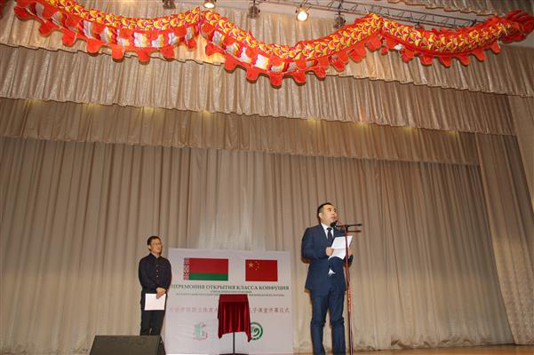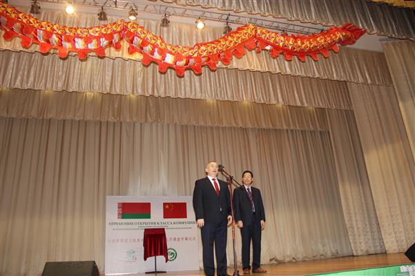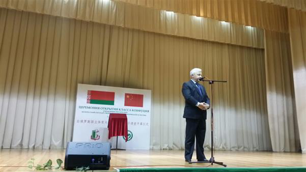 At the ceremony, M.A. Tozik congratulated on the establishment of the Confucius Classroom. He emphasized that this institute serves as a bridge connecting educational culture between the two countries and hoped both sides to consider it as an opportunity for further Sino-Belarus cooperation on sports culture. A.E. Samok hoped both sides to take advantage of this platform to further develop sports programs and technology cooperation to boost the development of sports talents. M.A. Rakoff said it is of great significance to the friendly Sino-Belarus relation as many teenagers in Belarus nowadays understand Chinese culture after studying at the Confucius Classroom (Institute). Wang Dajun congratulated the opening of the institution on behalf of the Chinese Embassy in Belarus and mentioned that it represents the first independent Confucius Classroom launched after the Confucius Classrooms opened under joint efforts of Jilin University and BNTU, Dalian University of Technology and BSU, and Southeast University and MSLU respectively. Wang Dajun said that the Confucius Institute (Classroom) represents the link to connect different cultures and the bridge for the promotion of Chinese culture and spiritual communication. He emphasized that, as martial arts, the treasure of Chinese culture, carries extensive and profound essence of Chinese sports, the Confucius Classroom offered by BSUPC, with features of martial arts, traditional Chinese health maintenance and the development of Chinese language talents, would bring new content and appeal to the Confucius Classroom. He reminded the audience that Confucius belongs to the world as well as China. Doctor Song Peng, the Chinese person in charge for the Confucius Classroom and representative from LNU, read the congratulatory letter from Ms. Xu Lin, Director-General of China’s Confucius Institute (Hanban).