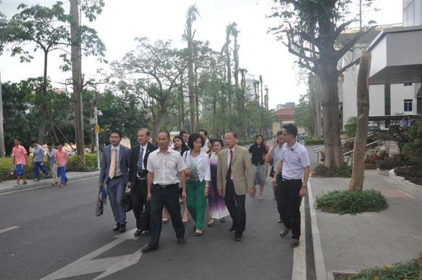 After the meeting, Deng Fengguang and Chen Dongying took President Wang and his entourage to visit the LNU campus. While admiring the unique design of the campus, the guests expressed solicitude and affirmation for post-disaster repair work of LNU.