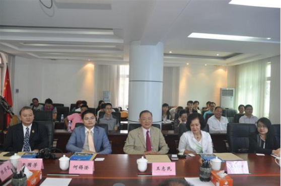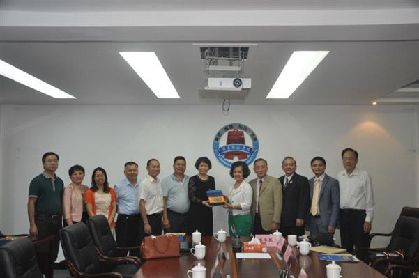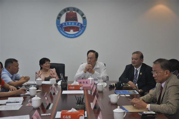 On October 30, 2015, the Thailand delegation for promotion of peaceful reunification of China, including Wang Zhimin, President of Thailand Council for the Promotion of Peaceful Reunification of China, Wang Linyizhu, Head of Women’s Department at Thai-Chinese Chamber of Commerce, He Xicheng, Director General of the Thailand Council for the Promotion of Peaceful Reunification of China, You Dongjie, reporter of The Sing Sian Yer Pao Daily News, and Wang Guofang, President of Thailand Young Entrepreneur Chamber of Commerce, visited Lingnan Normal University (LNU) in the company of Huang Zhongneng, deputy researcher of the United FrontWork Department of Zhanjiang Committee of CPC, and Chen Huakun, President of the Zhanjiang Branch of the Thai Chamber of Commerce. With great emphasis on the guest’s visit, LNU arranged Chief Accountant Lan Yanze, Director Deng Fengguang of the Office of International Exchange & Cooperation, Director Jin Yifu and Deputy Director Chen Dongying of the Scientific Research Office, Dean Wang Yaxin of the School of Business, Dean Liu Huiqing of the School of Humanities, Dean Cao Zhixi of the School of Foreign Languages, and Chief Librarian Chen Junqun, together with backbone members of the Collaborative Innovation Center for South China Sea Maritime Silk Road Studies, the Scientific Research Office and the Office of International Exchange & Cooperation, attended the meeting, and discussed with the guests concerning the possible cooperation and steps.