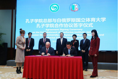 Lingnan Normal University News Center: At the 2019 International Chinese Language Education Conference held by Hanban in Changsha on the afternoon of December 10, the cooperation agreement on establishment of Belarusian State University of Physical Culture (BSUPC) Confucius Institute was officially signed by Ma Jianfei, Deputy Director of the Confucius Institute Headquarters (Hanban) and Durnou Viachaslau, First Deputy Minister of Ministry of Sports and Tourism of Belarus. The ceremony was witnessed by leaders and guests including Tian Xuejun,Vice Minister of Ministry of Education of China, Lan Yanze, President of Lingnan Normal University (LNU) Dai Shu, Vice President of LNU and Klinau Uladzimir, Vice Rector of BSUPC. Tian Xuejun awarded the plaque to Durnou Viachaslau and Lan Yanze. The Confucius Classroom, jointly run by the LNU and BSUPC, was upgraded to Confucius Institute.