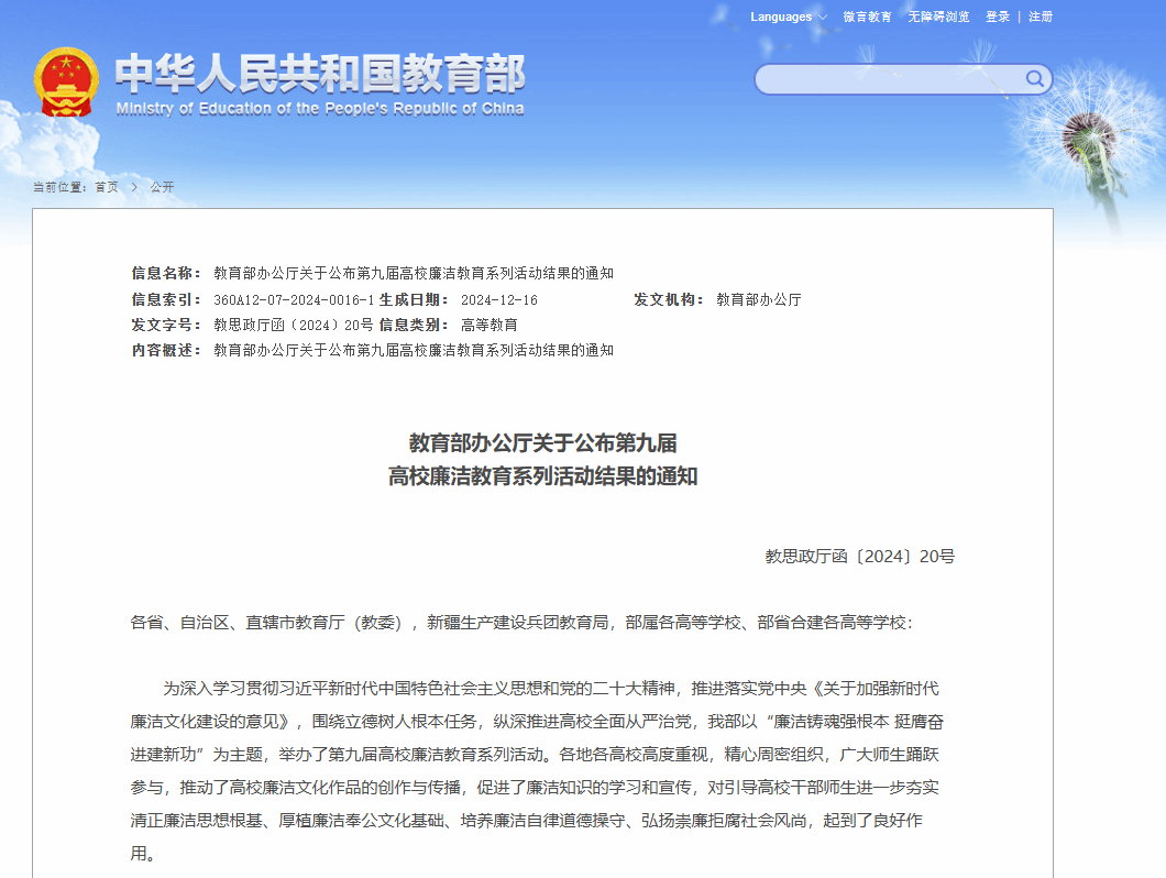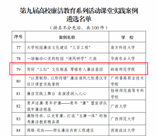 近日,教育部办公厅印发《关于公布第九届高校廉洁教育系列活动结果的通知》(教思政厅函〔2024〕20号)。学校马克思主义学院邓倩文申报的廉洁教育课堂实践案例《用好“三红”文化根基 厚植育人廉洁基因》入选全国100例课堂实践案例遴选名单,是全省入选的5项案例之一。这是学校第三次在全国高校廉洁教育系列活动中获奖。
