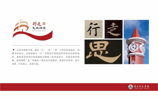 活动发布了“行走的思政课堂”文化标识。标识融合“行”“走”“思”三字意象为骨。主体造型中“行”字取材于学校百年师范纪念塔顶端造型,展现百年师范红色底蕴和立德树人的顶层设计,又暗含思字意象,底部提取“走”字最后一笔化为行走路径,寓意红色传承,且行且思,行在路上,走进心里。