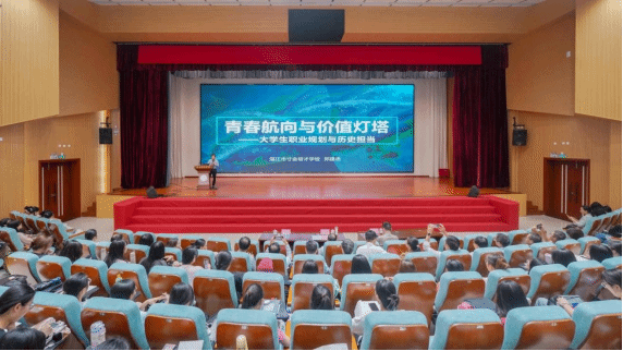 首期报告嘉宾郑建忠是学校优秀校友,广东省特级教师、中学语文正高级教师、广东省名校长工作室主持人,教育教研成果丰硕。他以“青春航向与价值灯塔——大学生职业规划与历史担当”为主题,分享了自己将家国情怀融入课堂,让书香国韵浸润校园,用坚守诠释师者信仰,以智慧播撒希望火种的思考和实践。他以对教育事业极致的真诚和热情为青年学子擎起价值的明灯、指引青春的航向,激励同学们把“小我”融入“大我”,肩负起历史和时代赋予的责任和使命,在追光的同时,成为点亮他人的火炬。