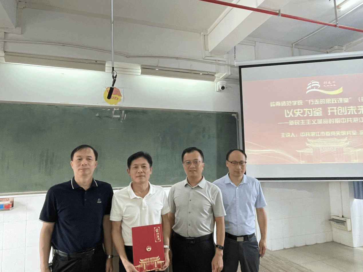 “李老师的讲授让港城的红色故事在岁月中熠熠生辉,让岭师红色校友的形象更加鲜活生动,引领同学们在学史中明理、增信、崇德、力行。”岭南师范学院马克思主义学院党总支书记邓倩文盛赞李振龙的报告,并为李振龙颁发“行走的思政课堂”主讲嘉宾纪念证书。马克思主义学院副院长施保国、贺永田、教师代表伊丽娜、龙琪秀等一同参加了报告会。