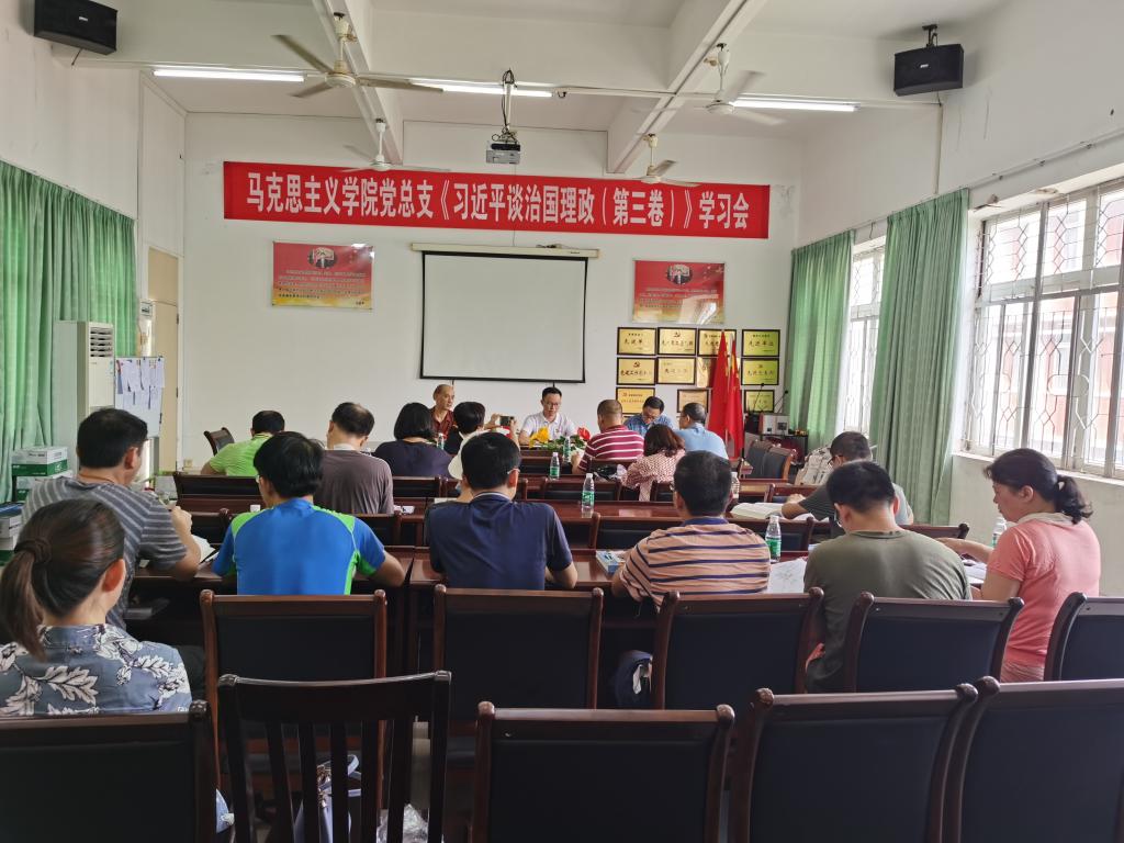 7月9日下午,马克思主义学院党总支在会议室召开《习近平谈治国理政》第三卷专题学习会,学院党总支委员、班子成员、各党支部书记及支委和教授博士代表共20人参加此次专题学习会,会议由学院党总支练有扬书记主持。