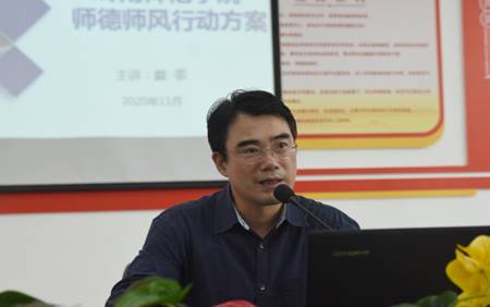 报告会上,戴黍从习近平总书记关于师德师风的论述、教育部有关政策文件,谈到社会上出现的正反面案例及其警示意义,以及学校师德师风建设工作部署等,全面、系统、精要地介绍了师德师风建设相关内容。他深入阐述了“四有好老师”的内涵,师德师风的“底标”(“红七条”)和“上标”(“十项准则”),并结合案例深刻剖析了当前社会存在的教书与育人相脱节、授业与传道相分离、师德师风欠佳、不能为人师表的问题。他强调,思政课是高校学生思政教育的主阵地、主渠道,马院老师在人们印象中是“最讲政治、党性最鲜明、政治素质最过硬”的一个群体,正因为如此社会对马院教师的师德师风标准更高、要求更严,也最为关注。希望老师们以更高的标准、更严的要求,自觉践行师德师风十项准则,努力成为塑造学生品格、品行、品味的“大先生”,成为学生做人的镜子。
