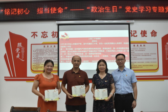何增光希望党员教师以此次活动为契机,在感受成就中进一步积蓄力量、在政治生日中进一步坚定信仰、在回顾历史中进一步砥砺初心,在教育事业的发展征程上谱写新篇章。施保国宣读达到30年党龄和本次过政治生日的同志的名单,由练有扬和何增光为他们颁发“政治生日纪念卡”。其中何增光、黄筱纯等入党多年的同志,以及党员代表林兴、伊丽娜等人深情分享了自己与党的故事,追忆入党初心,畅谈“政治生日”感言。全体党员还一同观看党史教育微视频,重温入党誓词。