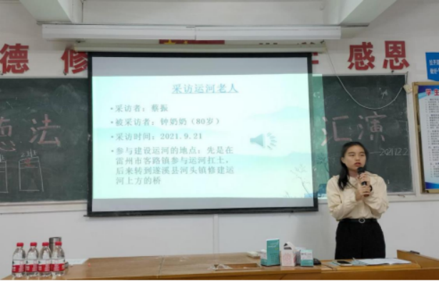 本次活动从中国精神、伟大建党精神、中国共产党人精神谱系、传承建库开河精神四个主题进行。活动前期,学生在课堂上听取林兴对建库开河精神的介绍后,为雷州青年运河建库开河亲历者的“担当、奋斗、奉献、创新”事迹所感动,部分同学曾前往遂溪、雷州实地走访了三个参与过雷州青年运河建设的耄耋老人。还有学生结合教学中的中国精神,实地走访湛江博物馆了解黄学增的故事和前往遂溪县烈士公园了解抗战史。