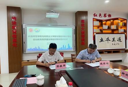 最后,在与会人员的共同见证下,茂名市育才学校党总支书记、校长陈铁平与岭南师范学院马克思主义学院副院长施保国签署了《岭南师范学院马克思主义学院与茂名市育才学校基础教育高质量发展结对帮扶协议》,两校将依据协议约定,携手合作共进,共圆教育梦想。今后五年两校将立足新时代教育改革发展大局,精准发力、精准施策,马院充分发挥教师在科研、党建、教学资源等方面的优势,聚焦育才学校教学改革、特色发展、校本教材编写、师资交流、教研培训等方面提供智力支持和资源条件,把握结对帮扶的契机,共同赋能基础教育高质量发展。