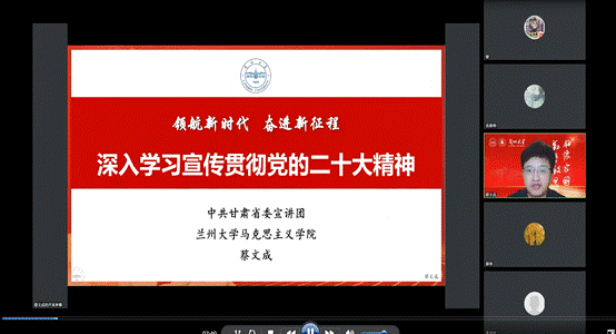 11月8日,甘肃省飞天青年学者、兰州大学马克思主义学院院长蔡文成教授应邀为我校马克思主义学院师生在腾讯会议作了题为《领航新时代 奋进新征程——深入学习宣传贯彻党的二十大精神》的辅导报告。报告就深入学习贯彻党的二十大精神,推动党的二十大精神全方位、多角度融入高校思政课展开研讨,推进新时代思政课高质量发展、推进马克思主义理论学科建设。副院长施保国主持报告会,近100名师生参加了线上会议。
