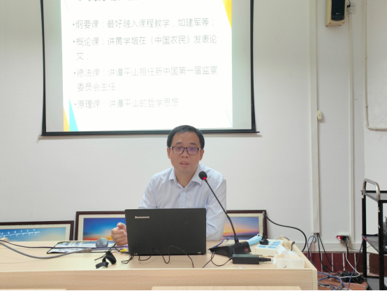 夏松涛以《浅析岭师红色校史人物融入思政课教学的路径》为题,分别从岭师红色校史人物概况、红色校史人物融入思政课的必要性、红色校史人物融入思政课的主要路径这三方面的内容进行深入分析,分享了红色校史人物融入思政课教学的方法要领、经验体会,诠释了思政课教学工作的重要使命与非凡意义。他强调,思政课教师要把红色校史人物这个“鲜活教材”融入思政课教学,将红色楷模精神融入思政课,充分发挥红色校史人物在思政教育中的作用,让校史人物的红色基因渗进血脉、浸润心灵,激发青年师生努力学习、积极创新。高校传承红色基因、赓续红色血脉,就要坚持不懈把红色校史作为“大思政”课程体系的必修课、常修课。
