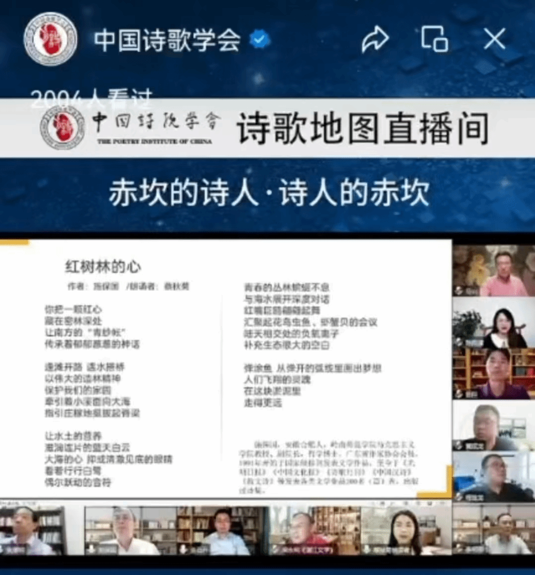 2023年3月19日晚上,中国诗歌学会诗歌地图频道以诗歌朗诵和点评的方式直播湛江(赤坎)诗群八位诗人的诗歌作品,开启一场别开生面的诗歌盛宴。省红树林生态文明建设科普基地负责人、岭南师范学院马克思主义学院副院长施保国教授创作的诗歌《红树林的心》(朗诵者:蔡秋菊)为广大网友呈现湛江红树林的神奇与诗意。