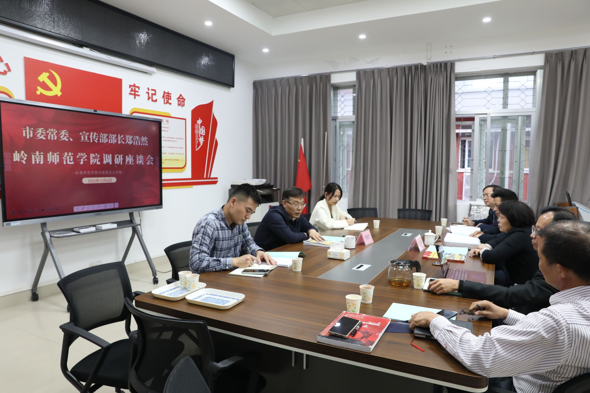 湛江市委宣传部办公室主任黄晓贤、文艺科科长李强,学校马克思主义学院党总支书记邓倩文、党委宣传部副部长郭莉敏一同参加了调研。